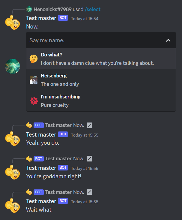 #include <dpp/dpp.h> #include <dpp/unicode_emoji.h> int main() { dpp::cluster bot("Epic Token"); bot.on_log(dpp::utility::cout_logger()); /* We now have a new character! That's for the select menu. */ dpp::emoji walter("walter_black", 1179374919088361544); dpp::emoji mad("mad", 1117795317052616704, dpp::e_animated); /* We need this third argument, which is an emoji flag. */ /* The event is fired when someone issues your commands */ bot.on_slashcommand([walter, mad](const dpp::slashcommand_t& event) { if (event.command.get_command_name() == "select") { dpp::message msg(event.command.channel_id, "Now."); msg.add_component( dpp::component().add_component( dpp::component() .set_type(dpp::cot_selectmenu) .set_placeholder("Say my name.") .add_select_option(dpp::select_option("Do what?", "Yeah, you do.", "I don't have a damn clue what you're talking about.").set_emoji(dpp::unicode_emoji::thinking)) .add_select_option(dpp::select_option("Heisenberg", "You're goddamn right!", "The one and only").set_emoji(walter.name, walter.id)) .add_select_option(dpp::select_option("I'm unsubscribing", "Wait what", "Pure cruelty").set_emoji(mad.name, mad.id, mad.is_animated())) /* Since our mad emoji is animated, we should tell that to the function */ .set_id("myselectid") ) ); event.reply(msg); } }); bot.on_select_click([](const dpp::select_click_t& event) { event.reply(event.values[0]); }); bot.on_ready([&bot](const dpp::ready_t& event) { if (dpp::run_once<struct register_bot_commands>()) { bot.global_command_create(dpp::slashcommand("select", "Send the select menu", bot.me.id)); } }); /* Start the bot! */ bot.start(dpp::st_wait); return 0; }